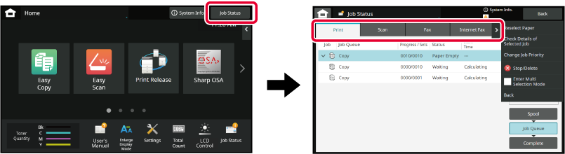 status, tap the [Spool], [Job Queue] or [Complete] key as desired.