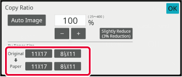 COPY MODESpecify the original size (paper size of the loaded original) and the copy size (paper size of the copy output).