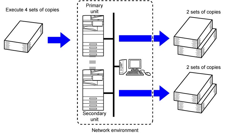 Up to 9999 copies (sets) can be set. The specified number of copies are shared between the primary unit and secondary unit. If the number of copies is odd, the primary unit makes more copies than the secondary unit.Tap the [Color Start] or [B/W Start] key to start copying.