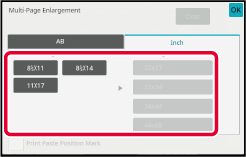 Tapping the key of the original size displays the keys that show the available enlargement size, copy paper size, and number of sheets.Tap the key of the size you want to enlarge the original to.