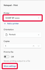 In Windows 10, select the printer driver for the machine and click the [Preferences] button.Select print settings.