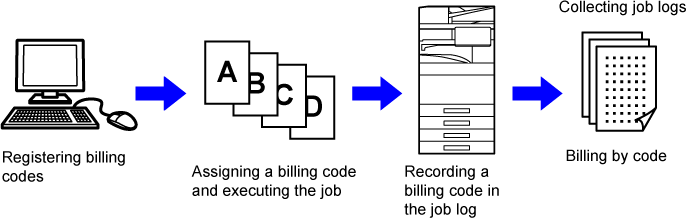 Used to categorize the results of the executed print and send jobs to enable efficient management. For example, you can assign a code by customer and collect cost information by customer from job logs. Code example: Issue of company A |