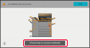 In this event, tap the [Check how to remove misfeeds] key in the touch panel.