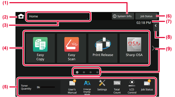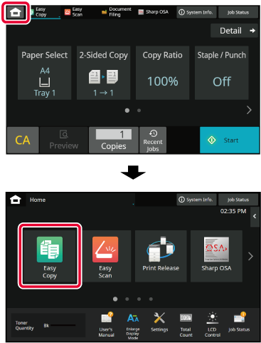 on the touch panel. The home screen displays the keys for selecting