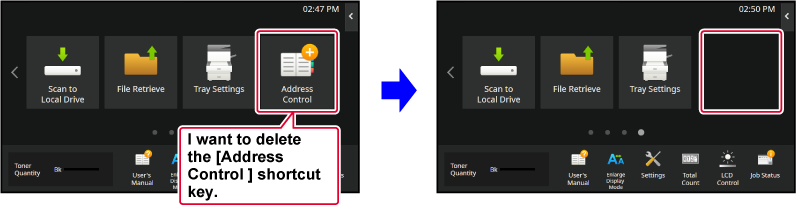 Some settings may require that you enter your user password after clicking [Home Screen Settings]. If you did not perform user authentication, you must enter the administrator password.Click [Condition Settings] and click the shortcut key you want to delete.