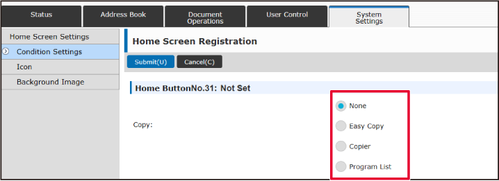 When you click the [Submit] button, the [Home Screen Registration] screen closes.When you have finished configuring the settings, click the [Submit] button.