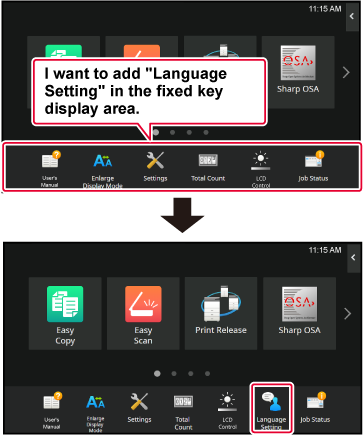 Some settings may require that you enter your user password after clicking [Home Screen Settings]. If you did not perform user authentication, you must enter the administrator password.Click [Condition Settings], and click the desired item under "Fix Key".