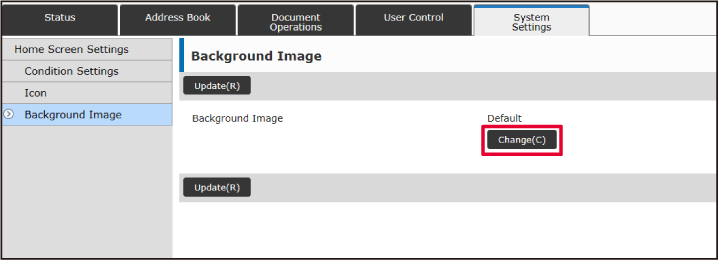Some settings may require that you enter your user password after clicking [Home Screen Settings]. If you did not perform user authentication, you must enter the administrator password.Click the [Change] button in [Background Image].