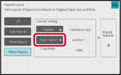 The maximum repeat count to copy images on a sheet is calculated automatically according to the original size, paper size, and copy ratio being selected from the base screen. |