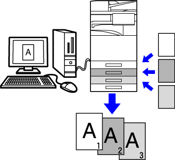 For example, if A4 (8-1/2" × 11") and A3 (11" × 17") size print images are mixed, only the A3 (11" × 17") size paper is folded and changed to A4 (8-1/2" × 11") size paper. Copies are output sheet by sheet. |