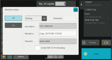 When the function is executed, the image data of the original is stored in the Quick File folder.Tapping the [File] key of the document