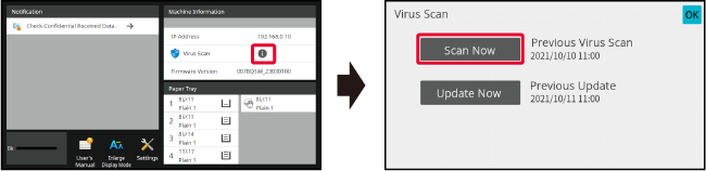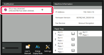 When a virus is detected with respect to the input data, the touch panel will display that a virus has been detected, the input data or the job to be input will be canceled, and the data or job data that was about to be output will be discarded. Data in the data input source (USB memory, external server, etc.) will not be deleted. When a virus is detected with the output data, the touch panel will display that a virus has been detected, the output data or the job to be output will be canceled, and the output data or job data will be deleted. The virus detection message will be displayed in the "Notification" of the System Information screen. |