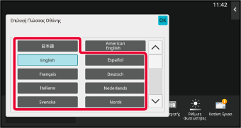 Για τις ρυθμίσεις αυτές ίσως απαιτείται να καταχωρήσετε τον ατομικό σας κωδικό πρόσβασης χρήστη. Εάν δεν χρησιμοποιείτε έλεγχο ταυτότητας χρήστη, πρέπει να εισαγάγετε τον κωδικό πρόσβασης διαχειριστή.Επιλέξτε τη γλώσσα που θέλετε να αλλάξετε από τη λίστα.