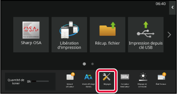 Le "Réglages" permet de gérer différentes fonctions afin de faciliter l'utilisation de la machine, par exemple l'enregistrement par défaut pour chaque fonction, le réglage de la connexion réseau et la vérification du journal de l'état de fonctionnement.
