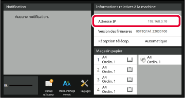 Imprimez l'adresse IP de la machine dans le mode réglage de cette dernière et entrez l'adresse dans le navigateur Web du PC.
