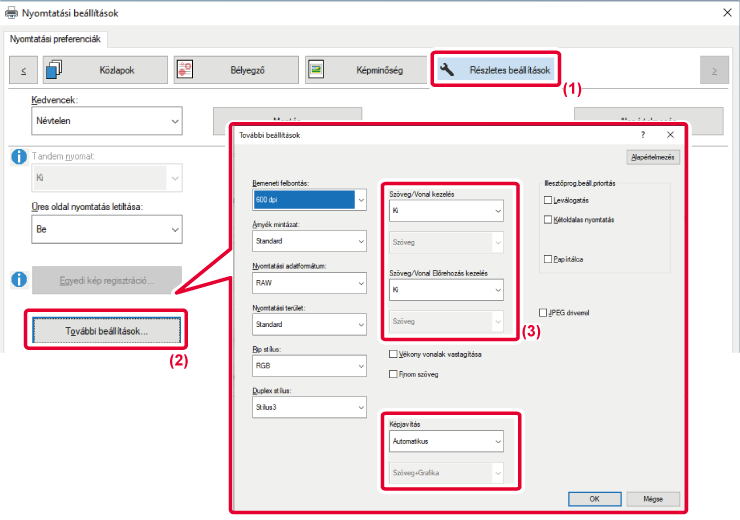 A szövegek és grafikák szélei elsimíthatók vagy élesebbé tehetők. Auto: Elvégzi az optimális képjavítást. Tiltva: Nincs képjavítás. Éles: Képjavítás élesítéssel. Lágy: Képjavítás élsimítással. |