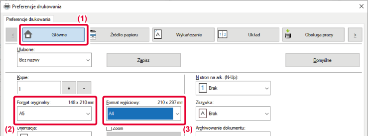 - Wybierz format oryginalny w polu [Format oryginalny] (na przykład: A5).