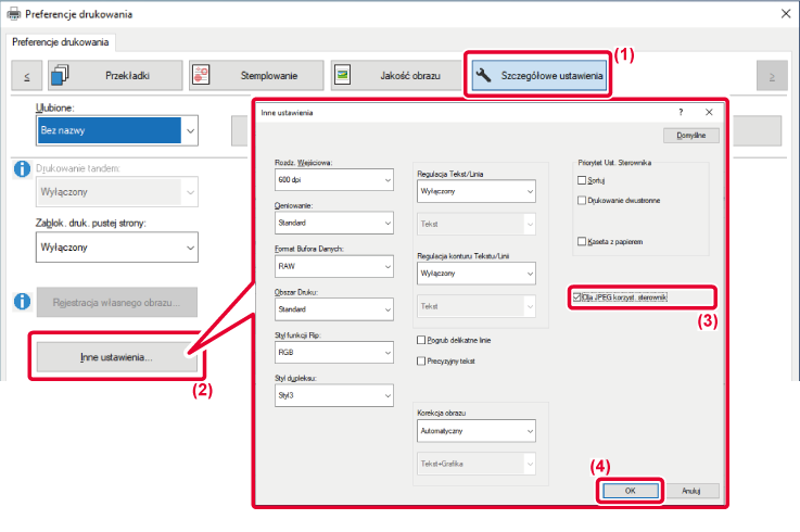 - Kliknij pole wyboru [Dla JPEG korzyst. sterownik], aby pojawił się symbol