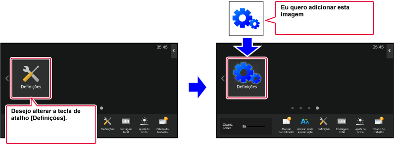 As definições serão guardadas na máquina e aplicadas.Esta secção explica como mover uma tecla de atalho no ecrã inicial.