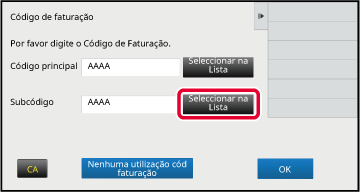 Quando a janela de introdução do código de faturação é apresentada, toque na tecla [Seleccionar na Lista] do código principal.