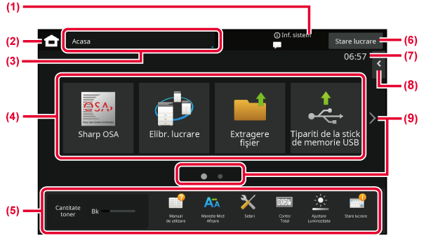 Atingerea tastei [Ecran principal] afișează ecranul principal pe panoul tactil. Ecranul