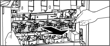 Purista ensin yhteen kuvayksikön vasemman ja oikean puolen lukitsimet ja vedä kuvayksikkö ulos hitaasti vaaka-asennossa.