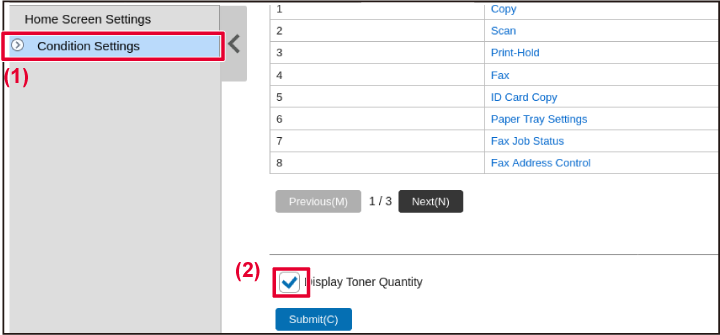 ).Check the "Display Toner Quantity" checkbox and click the [Submit] button.