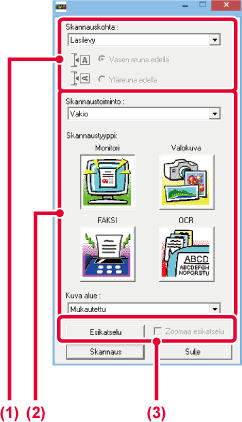 Sélectionnez la zone de numérisation. Si "Auto" est sélectionné, le format de l'original défini sera numérisé. Vous pouvez également définir la zone de numérisation dans la fenêtre d'aperçu à l'aide de votre souris.