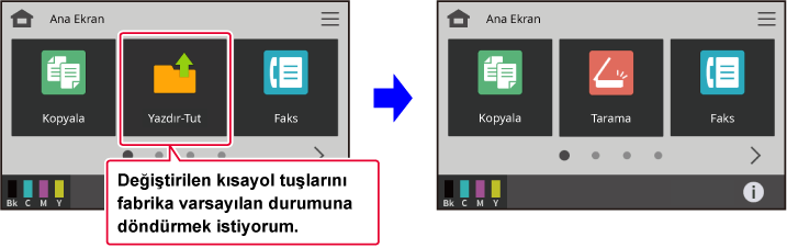 Ayarlar makineye kaydedilir ve uygulanır.Bu bölümde ana ekrandaki kısayol tuşlarını