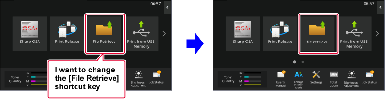 To change a shortcut key from the touch panel, move the shortcut key in the desired