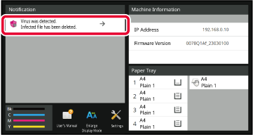 When a virus is detected with respect to the input data, the touch panel will display that a virus has been detected, the input data or the job to be input will be cancelled, and the data or job data that was about to be output will be discarded. Data in the data input source (USB memory, external server, etc.) will not be deleted. When a virus is detected with the output data, the touch panel will display that a virus has been detected, the output data or the job to be output will be cancelled, and the output data or job data will be deleted. The virus detection message will be displayed in the "Notification" of the System Information screen. |