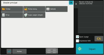Tapez sur [Sélectionner fichier à impr. depuis clé USB] ou [Sélect. fichier à impr. depuis dossier réseau] dans le panneau de commandes.