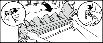 Premere i pulsanti di sgancio sui lati della vaschetta raccogli toner, spingere la vaschetta verso il basso finché non si arresta.