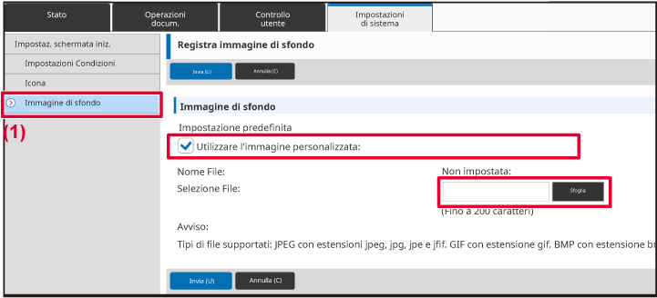 Spuntarela casella di controllo [Utilizzare l'immagine personalizzata] e selezionare l'immagine con [Selezione File].