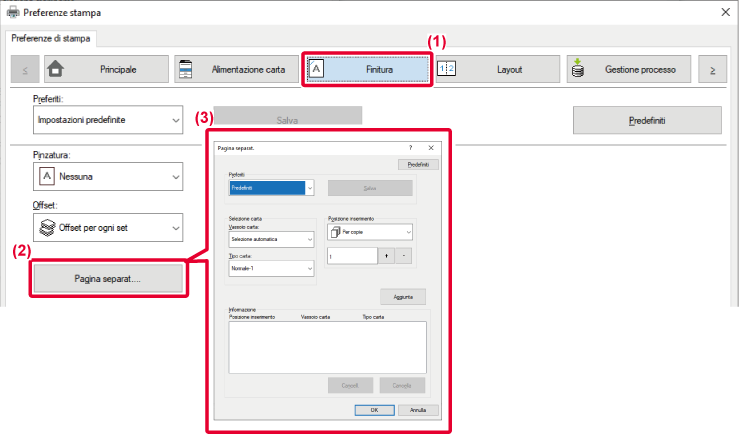 È possibile inserire le pagine separatore tra i lavori o il numero specificato di