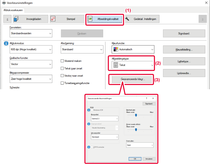 wordt weergegeven.De printerdriver is voorzien van diverse standaard kleurinstellingen voor verschillende