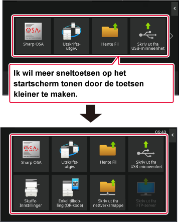 Innstillingene lagres i maskinen og tas i bruk.Du kan legge til snarveistaster på hovedskjermen, og du kan slette unødvendige snarveistaster.