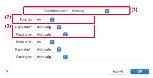 Velg utskriftsinnstilling, papirskuff og papirtype for omslagssiden og den siste siden.