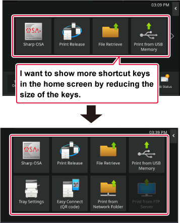 The settings are saved in the machine and applied.You can add shortcut keys to the home screen, and delete unneeded shortcut keys.