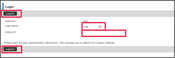 • For details on login procedures when user authentication is enabled, see "USER AUTHENTICATION".