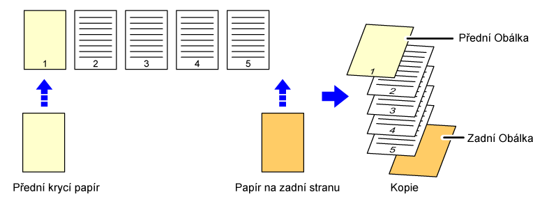 ![]() Vloží přední obálku na začátek kopií a zhotoví jednostrannou kopii na šesté straně originálu pro zadní obálku. |