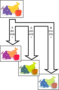 jedné ze tří barevných složek: R (červená), G (zelená) nebo B (modrá).