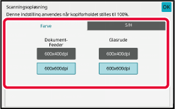 Opløsningen kan indstilles til både dokumentfeeder og glasplade. Når indstillingerne er angivet, skal du trykke på tasterne [OK] og [Tilbage] efter hinanden.