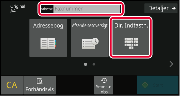 Tryk på tasten [Dir. Indtastn.] eller [Faxnummer] for at indtaste et destinationsfaxnummer.