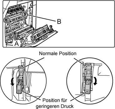 Schieben Sie die Auslösehebel für Fixierdruck (zwei) in die Position für geringeren Druck, wie dargestellt.