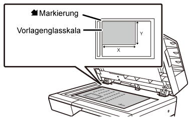 Legen Sie das Original mit der bedruckten Seite nach unten ein, und richten Sie die obere linke Ecke des Originals mit der hinteren linken Ecke (an der Spitze der Markierung