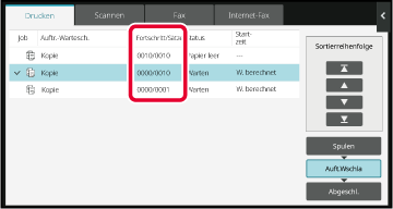 Berühren Sie die Auftragsstatusanzeige und anschließend die Taste für den Auftrag, dessen Inhalt geprüft werden soll.