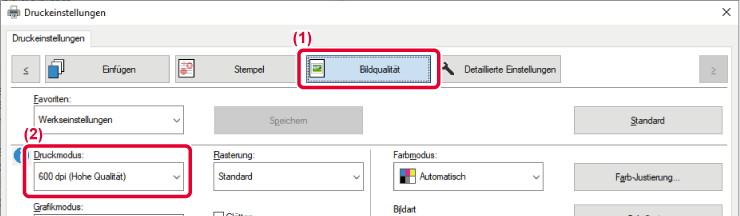 Für den "Druckmodus" (Auflösung) sind die folgenden