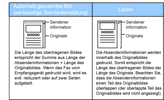 Sie können Ihre Absenderdaten (Datum, Uhrzeit, Absendername, Absenderfaxnummer oder Zielname, Seitenzahl) automatisch am oberen Rand jeder übertragenen Faxseite einfügen.