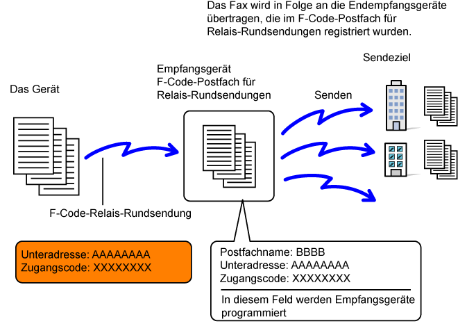 empfängt, wird das Fax im F-Code-Postfach für Relais-Rundsendungen